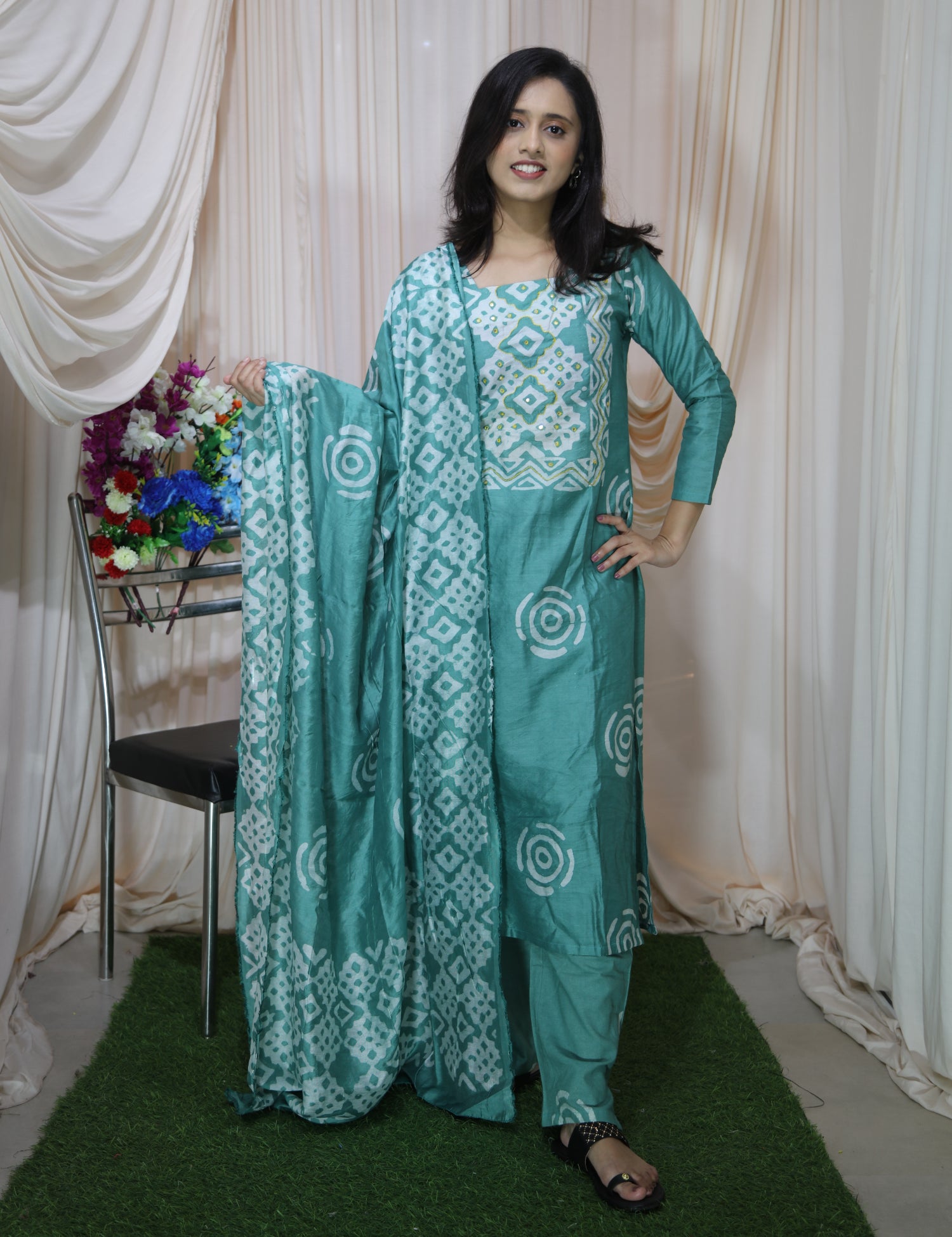 green jungle bandhni print, silhouette, like a lazy summer afternoon. kurti and normal pants in waist front belt and back elastic.