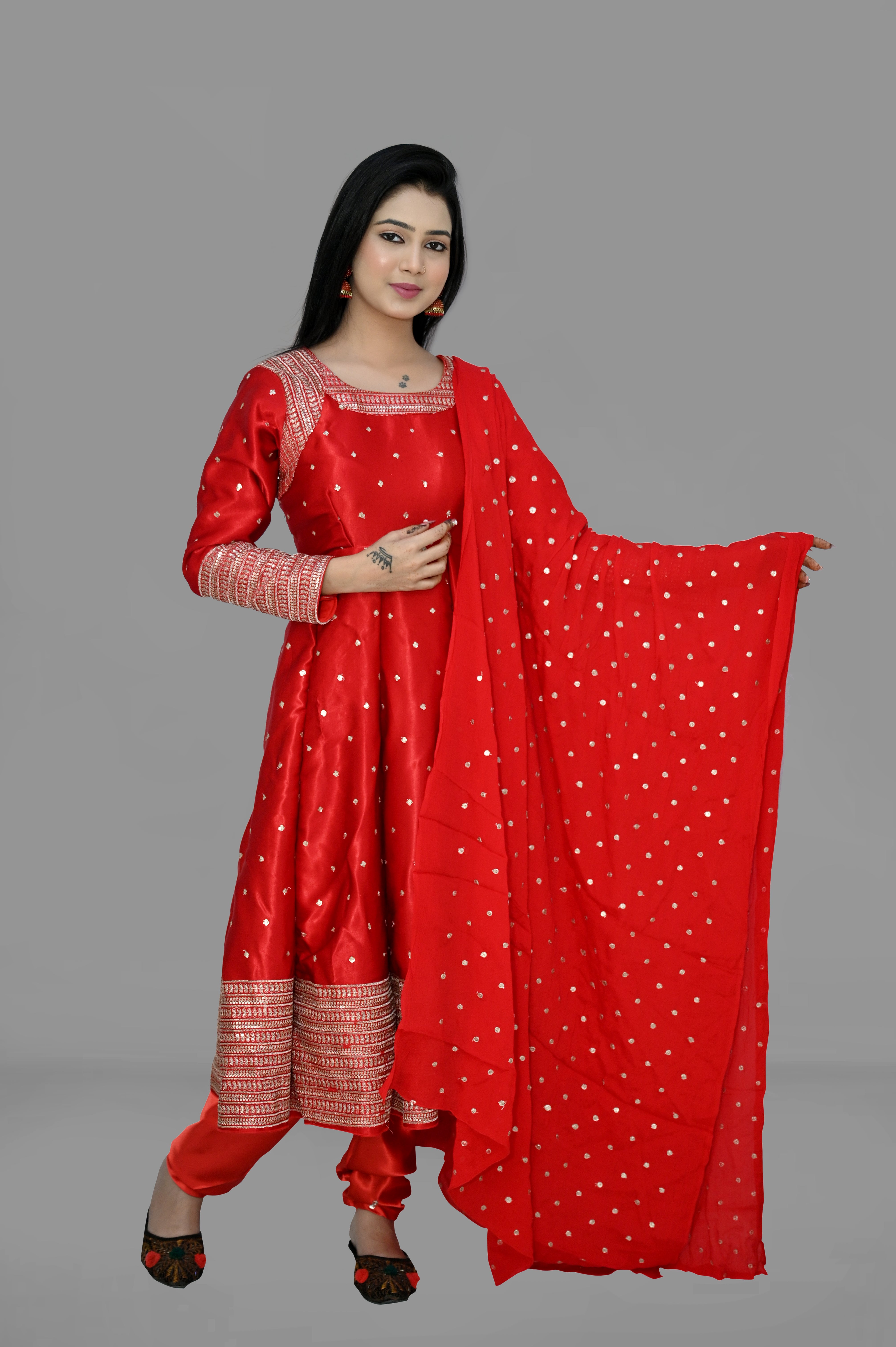 Enhance your wardrobe with this stylish anarkali kurti, round neck, long sleeves and chudidar salwar and dupatta in a vibrant Red color. Perfect for any occasion, this versatile piece is made with high-quality rayon fabric for comfort and durability. Features include detailed pleating and a flattering fit for all body types.