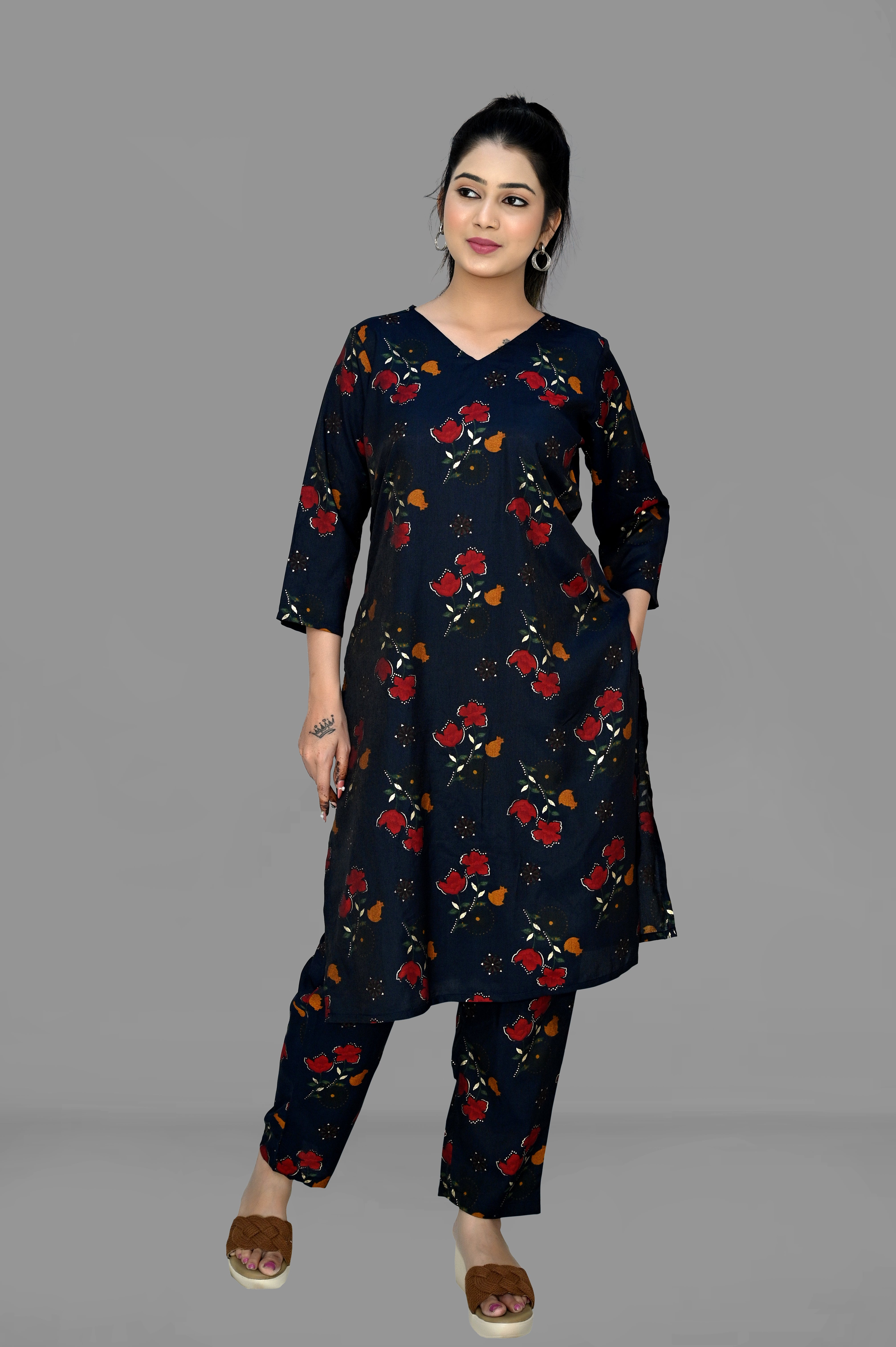 Enhance your wardrobe with this stylish kurti, v neck and 3/4 sleeves, cut on both side, normal pant in a vibrant Blue color. Perfect for any occasion, this versatile piece is made with high-quality rayon fabric for comfort and durability. Features include detailed pleating and a flattering fit for all body types.