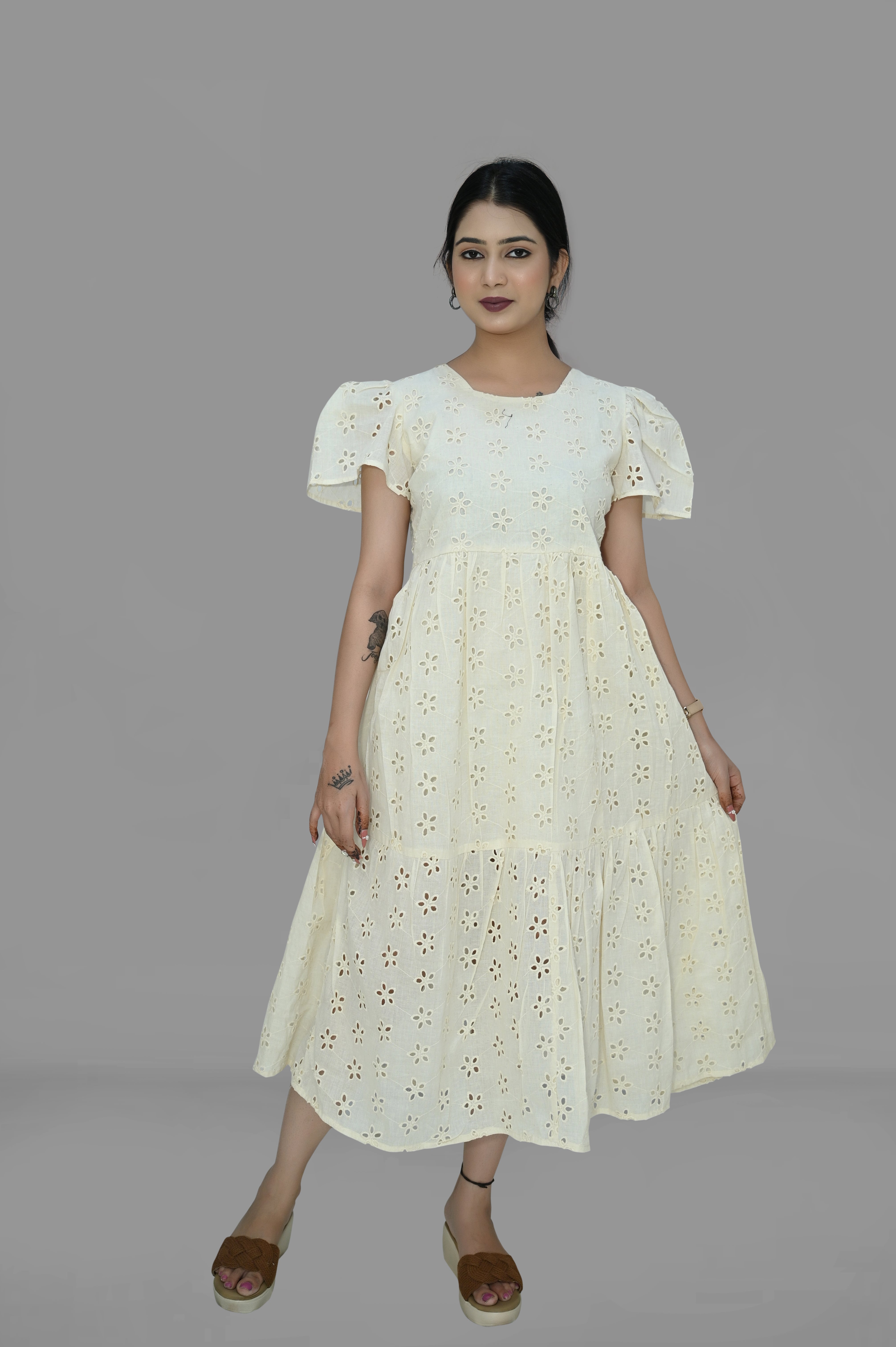 Enhance your wardrobe with this stylish one piece with square neck, feather sleeves, one tier in a vibrant Nude/beige color. Perfect for any occasion, this versatile piece is made with high-quality rayon fabric for comfort and durability. Features include detailed pleating and a flattering fit for all body types.