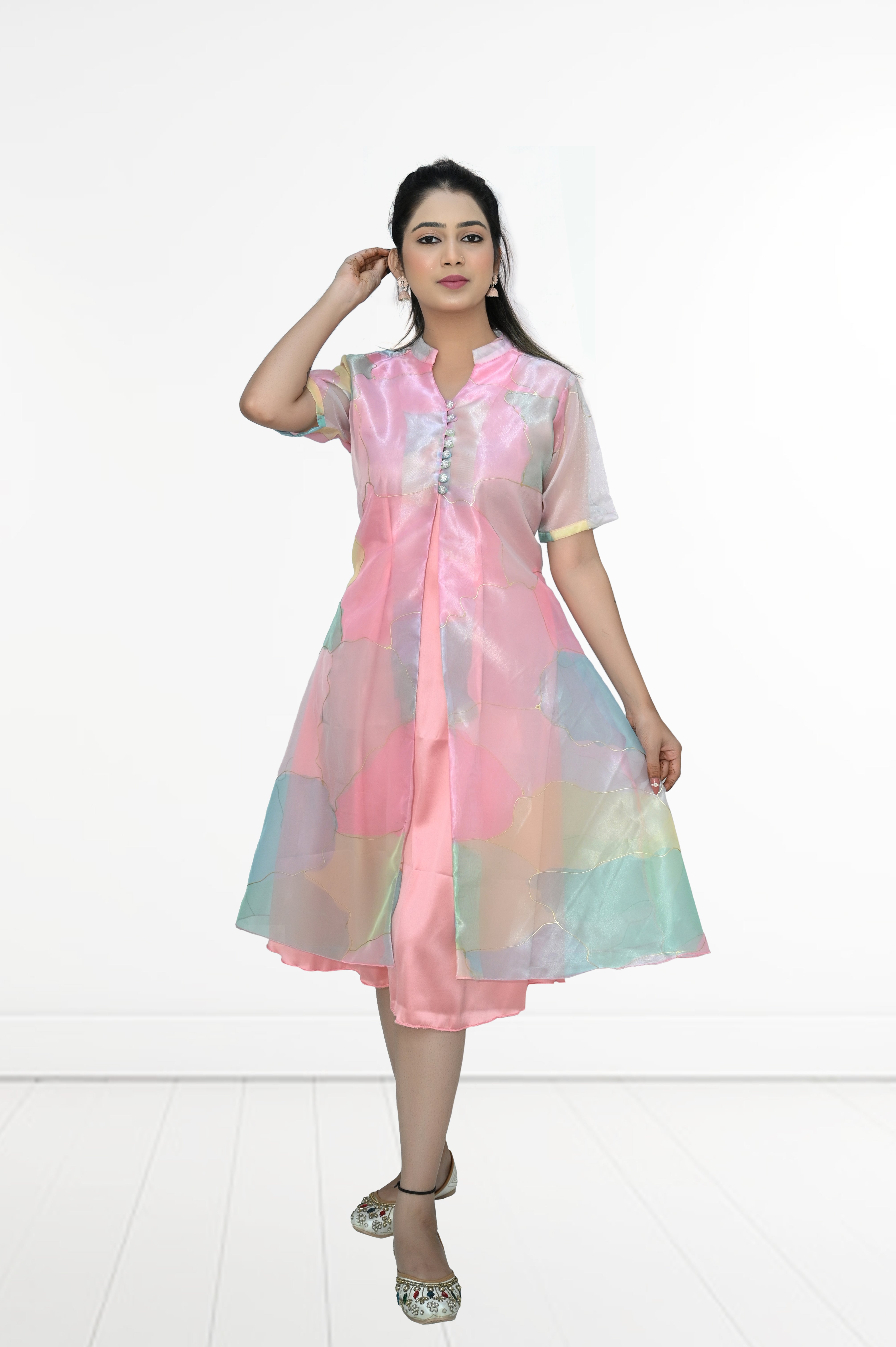 Enhance your wardrobe with this stylish chinses collar, 9"sleeves, 8 buttons with lupin in front side, front side cut in a vibrant Pink color. Perfect for any occasion, this versatile piece is made with high-quality rayon fabric for comfort and durability. Features include detailed pleating and a flattering fit for all body types.
