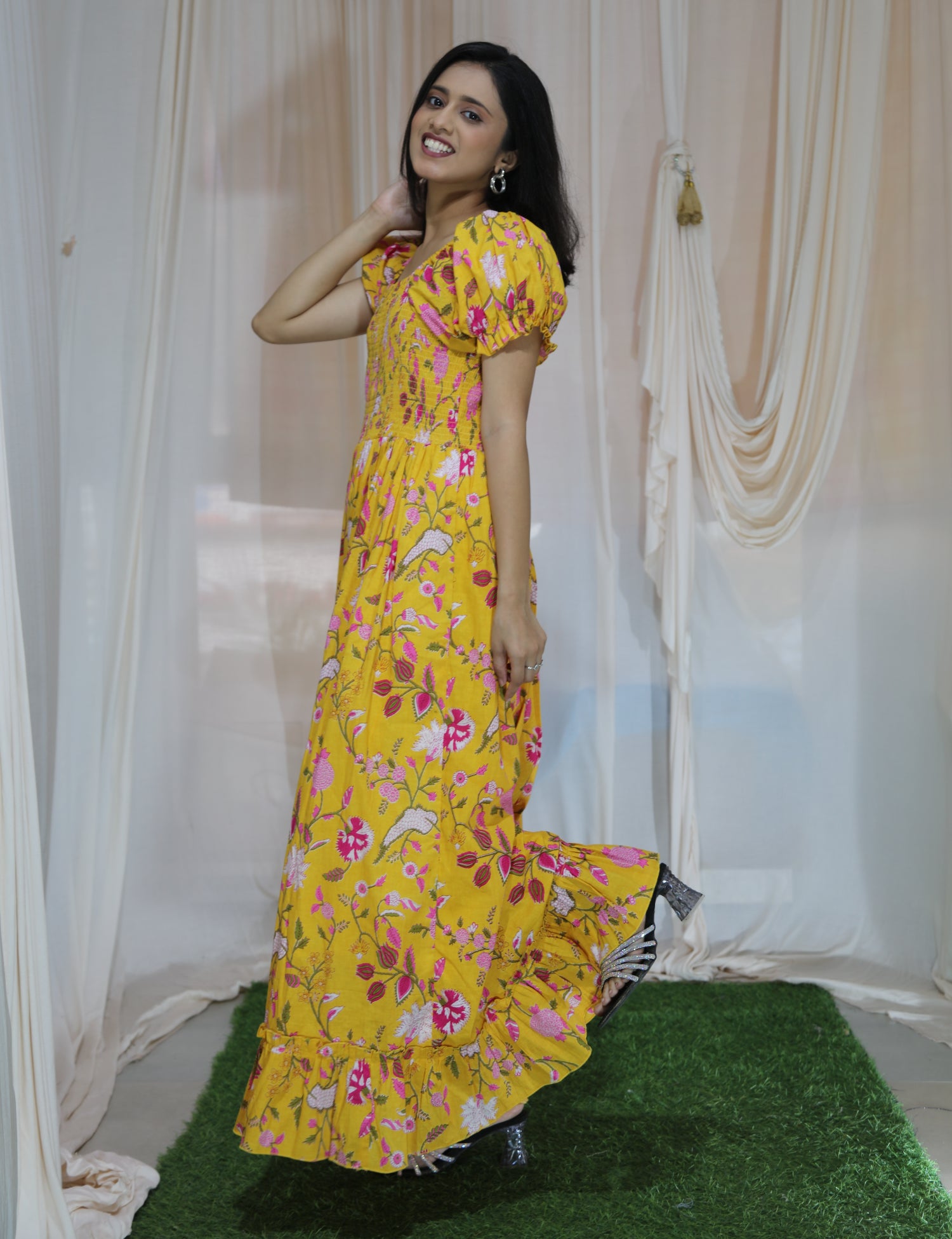 Yellow coloured Ballon Sleeves, Smoking neck .