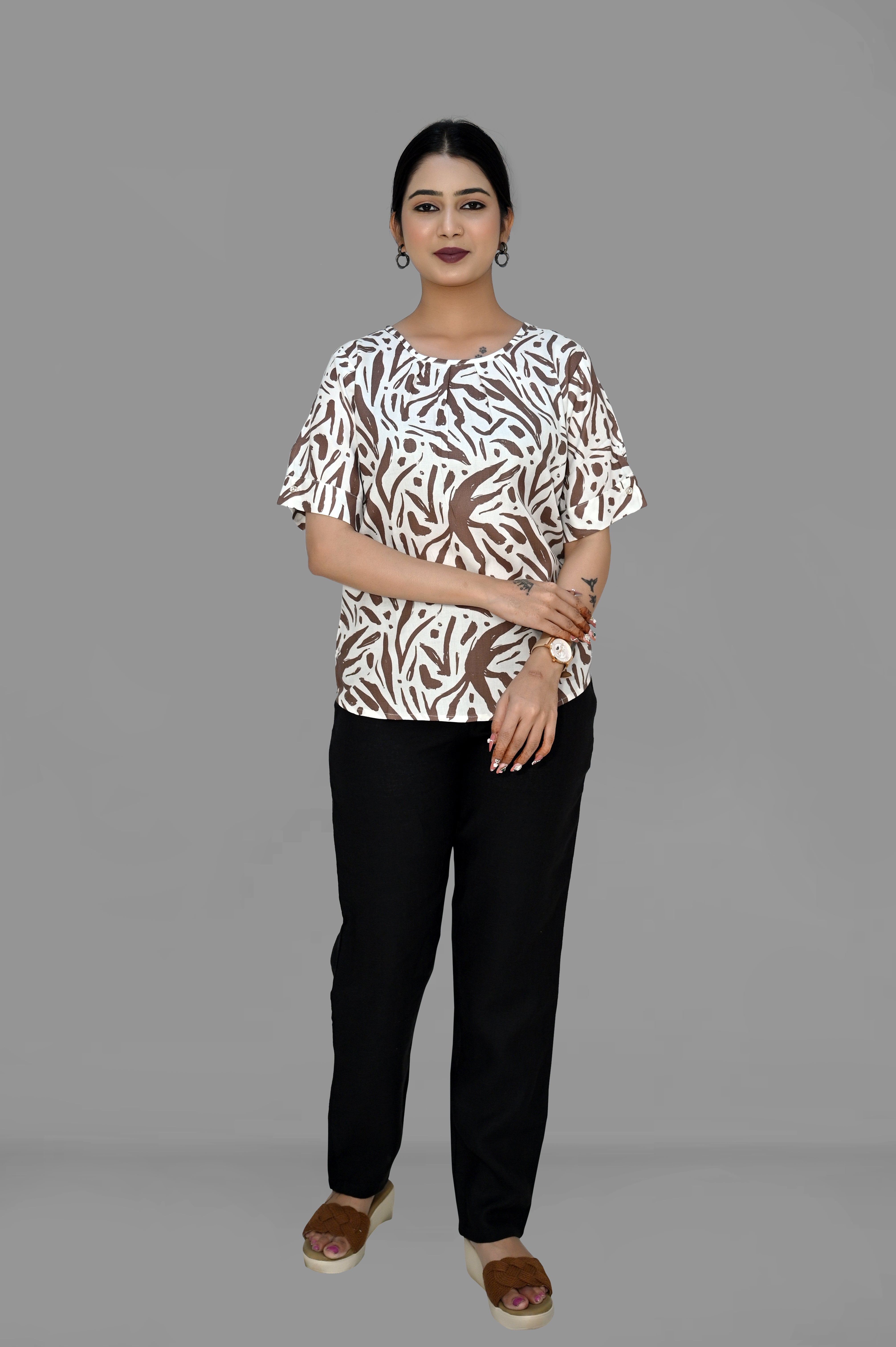 Enhance your wardrobe with this stylish printed rayon pleated top,9'' sleeves, in a vibrant Brown color. Perfect for any occasion, this versatile piece is made with high-quality rayon fabric for comfort and durability. Features include detailed pleating and a flattering fit for all body types.