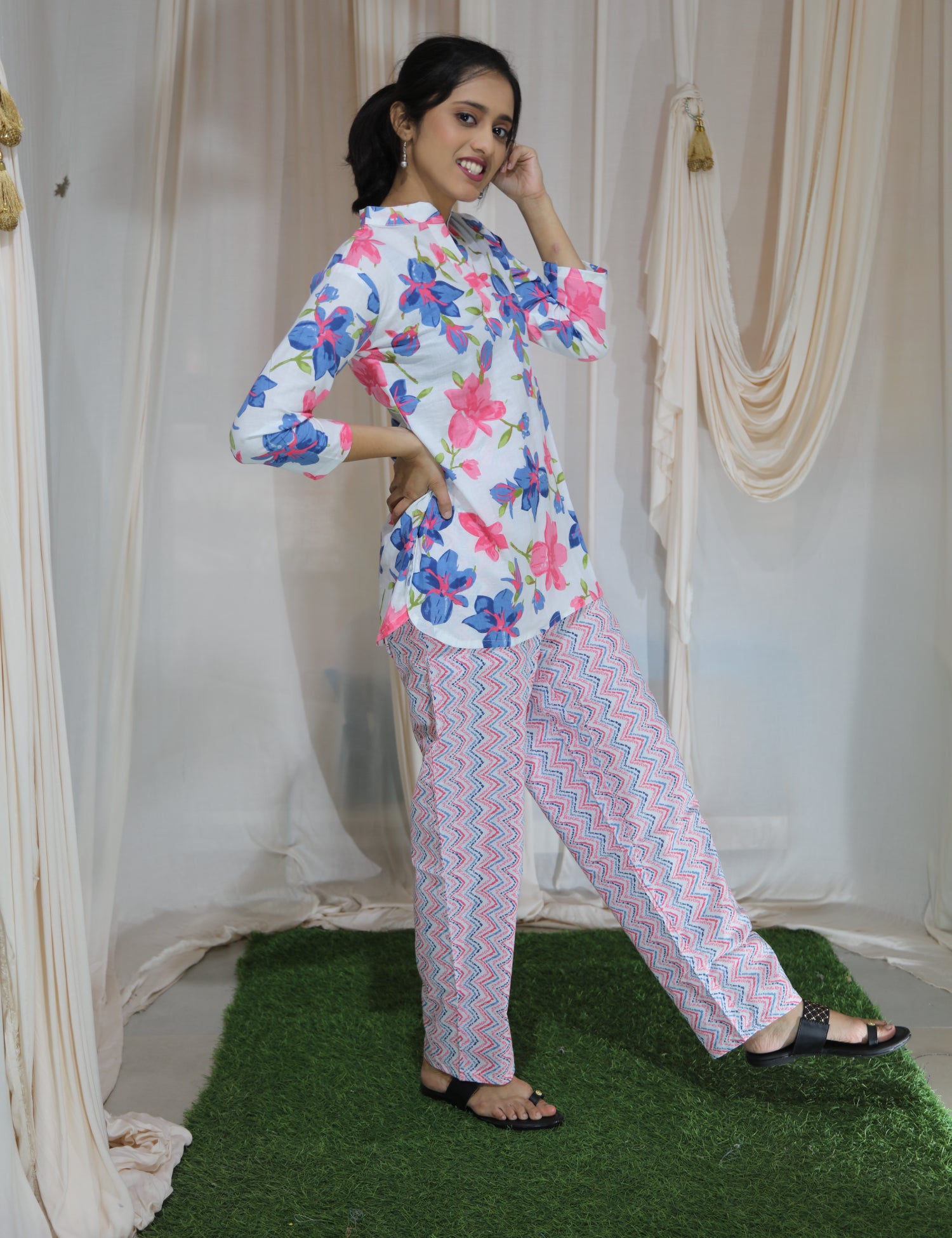 Printed cotton two-piece co-ord blue/white (set of 2)Normal Pants in waist front belt and back elastic.